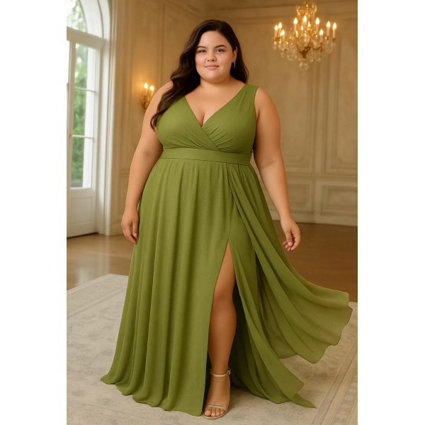 👗Vestido plus size verde oliva alça larga fenda em lurex. Lindo demais né?