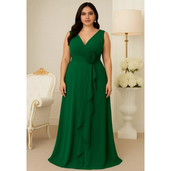 👗Vestido plus size verde esmeralda alça larga flor cintura babado saia em crepe. Lindo demais né?