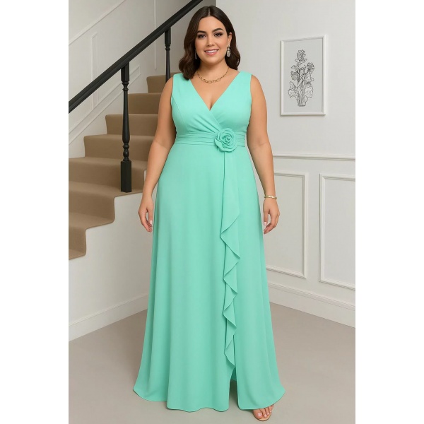 👗Vestido plus size verde menta alça larga flor cintura babado saia em crepe. Lindo demais né?