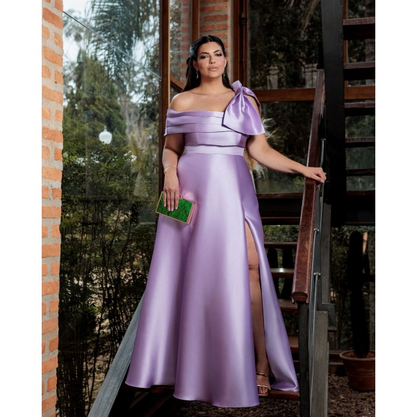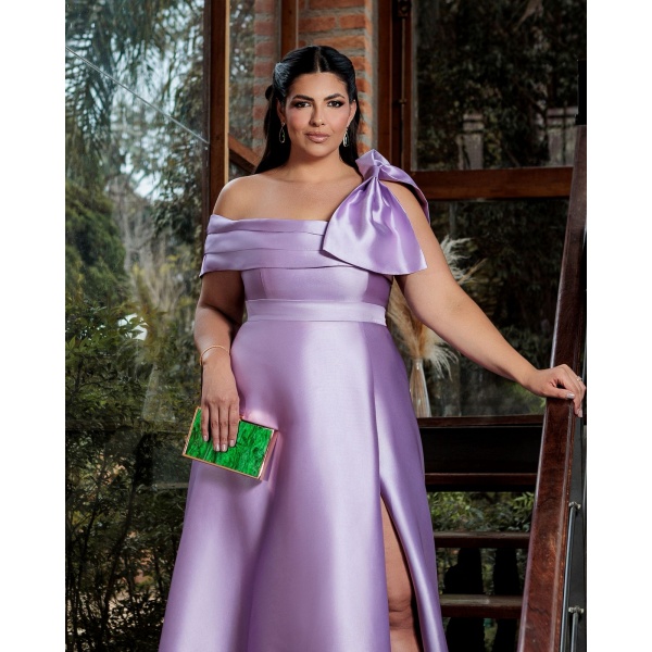 👗Vestido plus size lilás busto com 3 faixas e laço em zibeline. Lindo demais né?