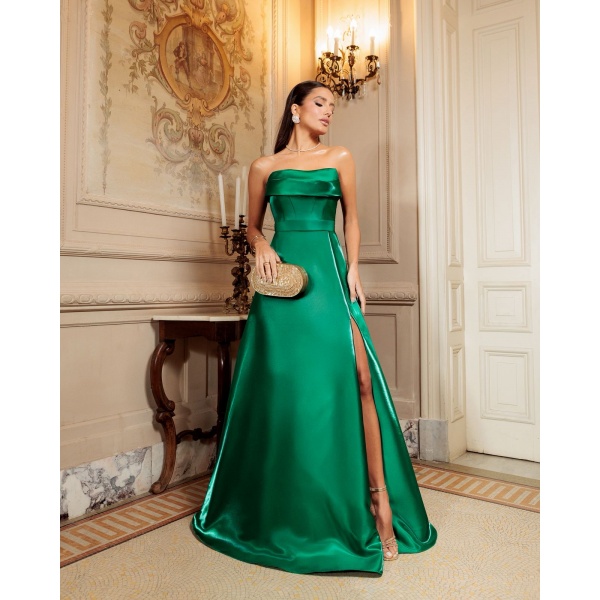 👗Vestido longo verde esmeralda tomara que caia pala busto e fenda em zibeline gloss. maravilhoso