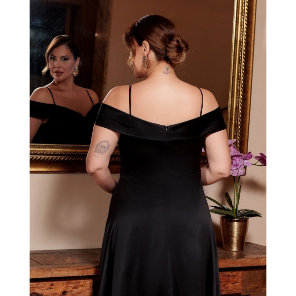 vestido plus size verde oliva ombro a ombro fenda em crepe prada. Maravilhoso!