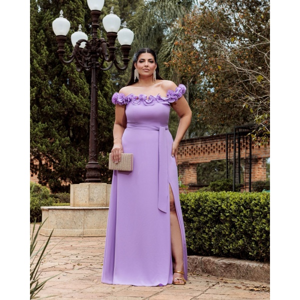 👗Vestido plus size lilás ombro a ombro com aplicação, faixa cintura e fenda em crepe. Um arraso!