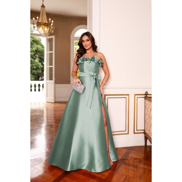 👗Vestido longo verde menta tomara que caia flor busto, faixa cintura e fenda em zibeline. maravilhoso
