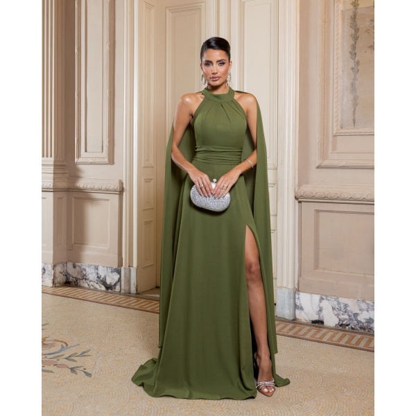 👗Vestido longo verde oliva gola alta cap dress faixa cintura e fenda em crepe. Um arraso!