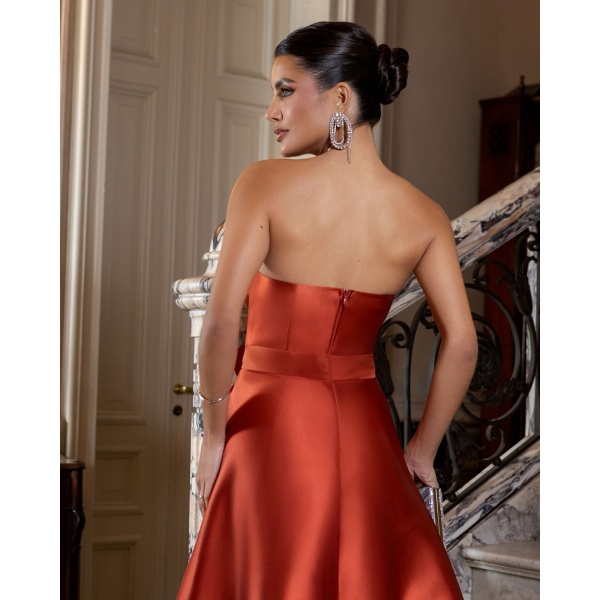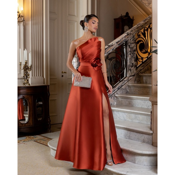 👗Vestido longo terracota tomara que caia busto drapeado flor cintura fenda em zibeline. Um arraso!