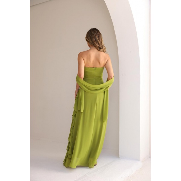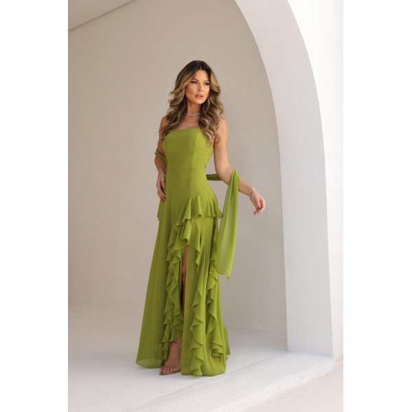 👗Vestido longo verde oliva tqc echarpe e babado saia fenda em crepe. Um arraso!