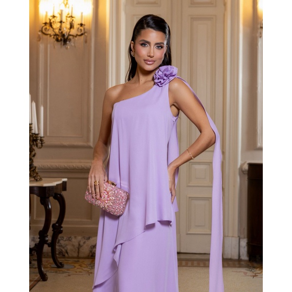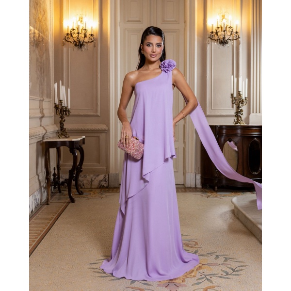 👗Vestido longo lilas em musseline um ombro so com flor no ombro, faixa e saia sobreposicao. Um arraso!