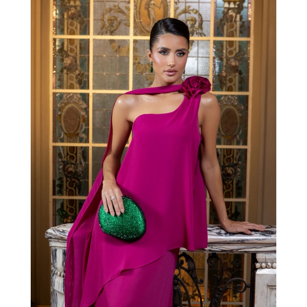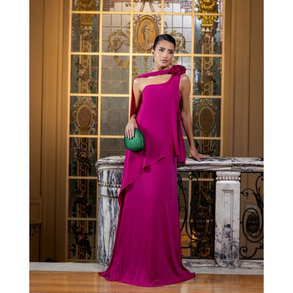 👗Vestido longo fucsia em musseline um ombro so com flor no ombro, faixa e saia sobreposicao. Um arraso!