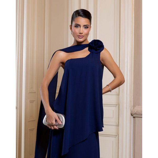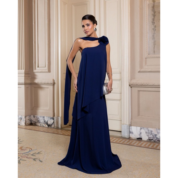 👗Vestido longo azul marinho em musseline um ombro so com flor no ombro, faixa e saia sobreposicao. Um arraso!