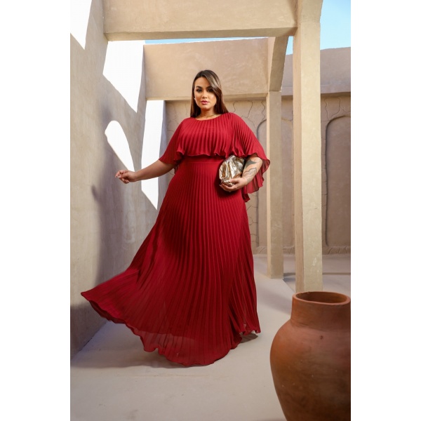 👗Vestido longo marsala em crepe inteiro plissado com manga capa curta, Um arraso!