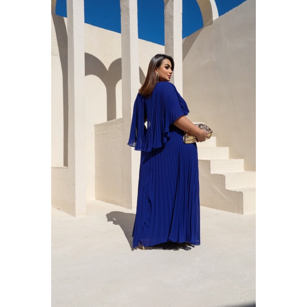 👗Vestido longo azul royal em crepe inteiro plissado com manga capa curta, Um arraso!