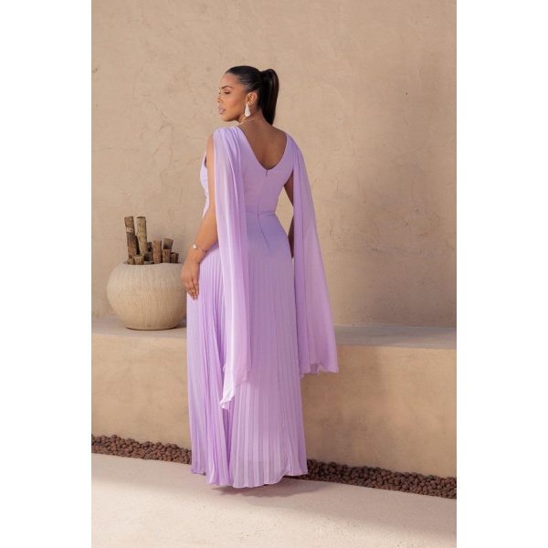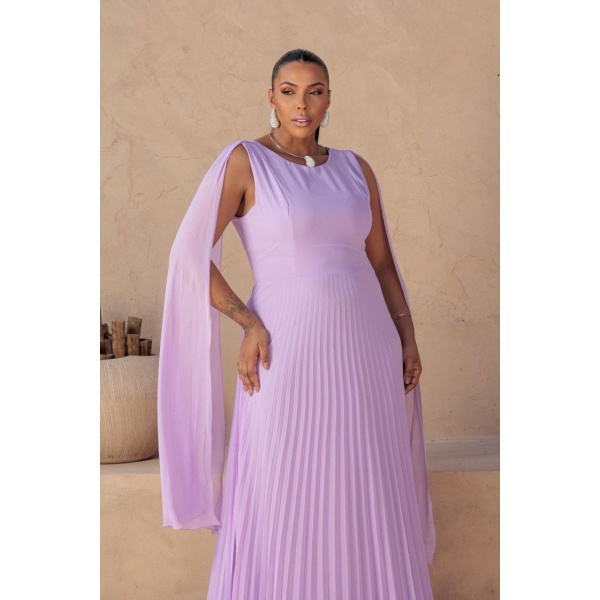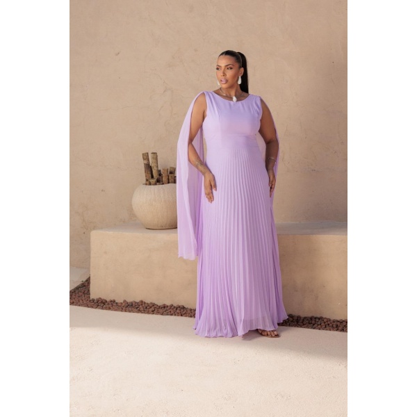 👗Vestido longo lilas em crepe com saia plissada e manga capa. Um arraso!