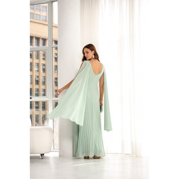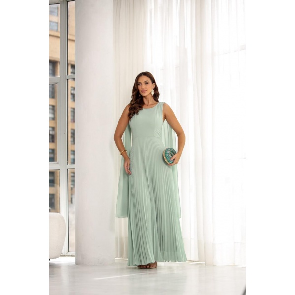 👗Vestido longo verde menta em crepe com saia plissada e manga capa. Um arraso!