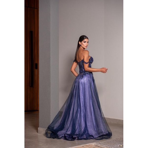 👗Vestido roxo ombro a ombro com corpete bordado e saia em tule de brilho. O vestido dos sonhos!
