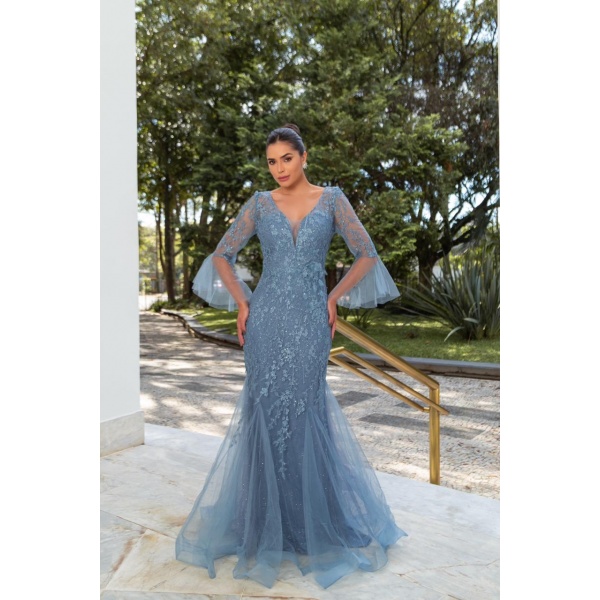 👗Vestido longo bordado azul semi sereia meia manga. O vestido dos sonhos!