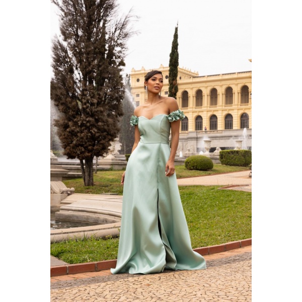 vestido verde menta ombro a ombro com aplique costas trançadas e fenda em zibeline. Maravilhoso!