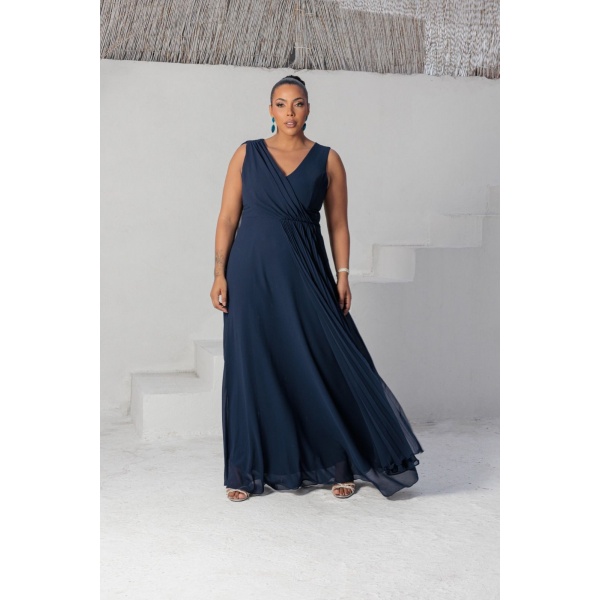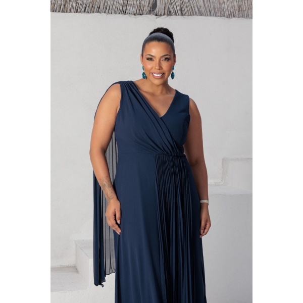 vestido azul marinho alça larga lado plissado em crepe. Maravilhoso!