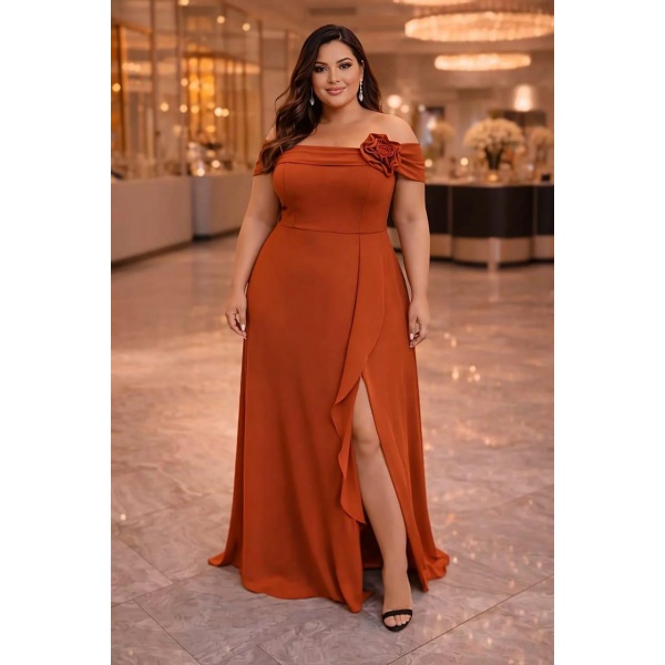 👗Vestido plus size terracota ombro a ombro flor e fenda em crepe. Lindo demais né?