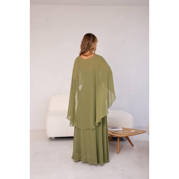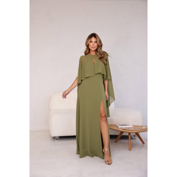 👗Vestido longo verde oliva alcinhas com cap dress e fenda em crepe. Um arraso!