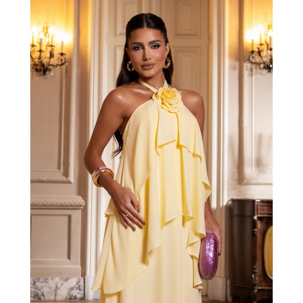 👗Vestido longo amarelo amarrar pescoço e flor em musseline. Lindo demais né?