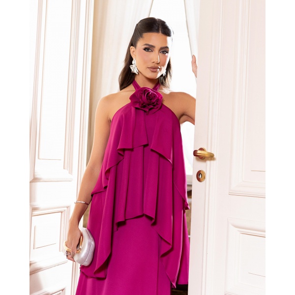 👗Vestido longo fúcsia amarrar pescoço e flor em musseline. Lindo demais né?