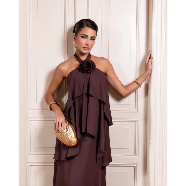 👗Vestido longo marrom amarrar pescoço e flor em musseline. Lindo demais né?