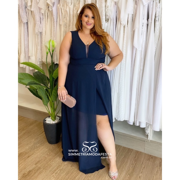 Vestido plus size azul marinho alça larga e fenda. Um arraso!