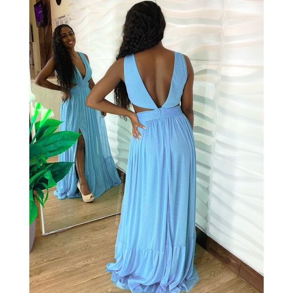 Vestido longo azul serenity cintura vazada com fivela. Um arraso!